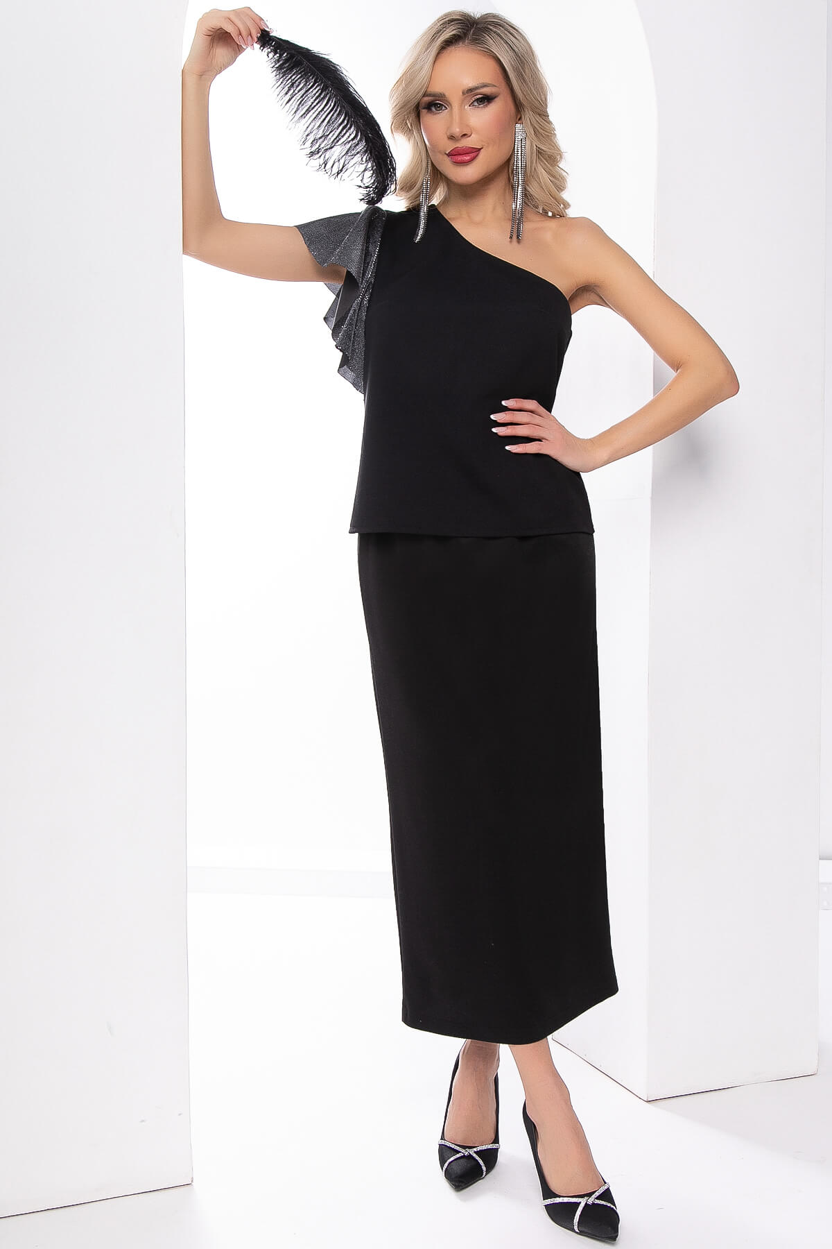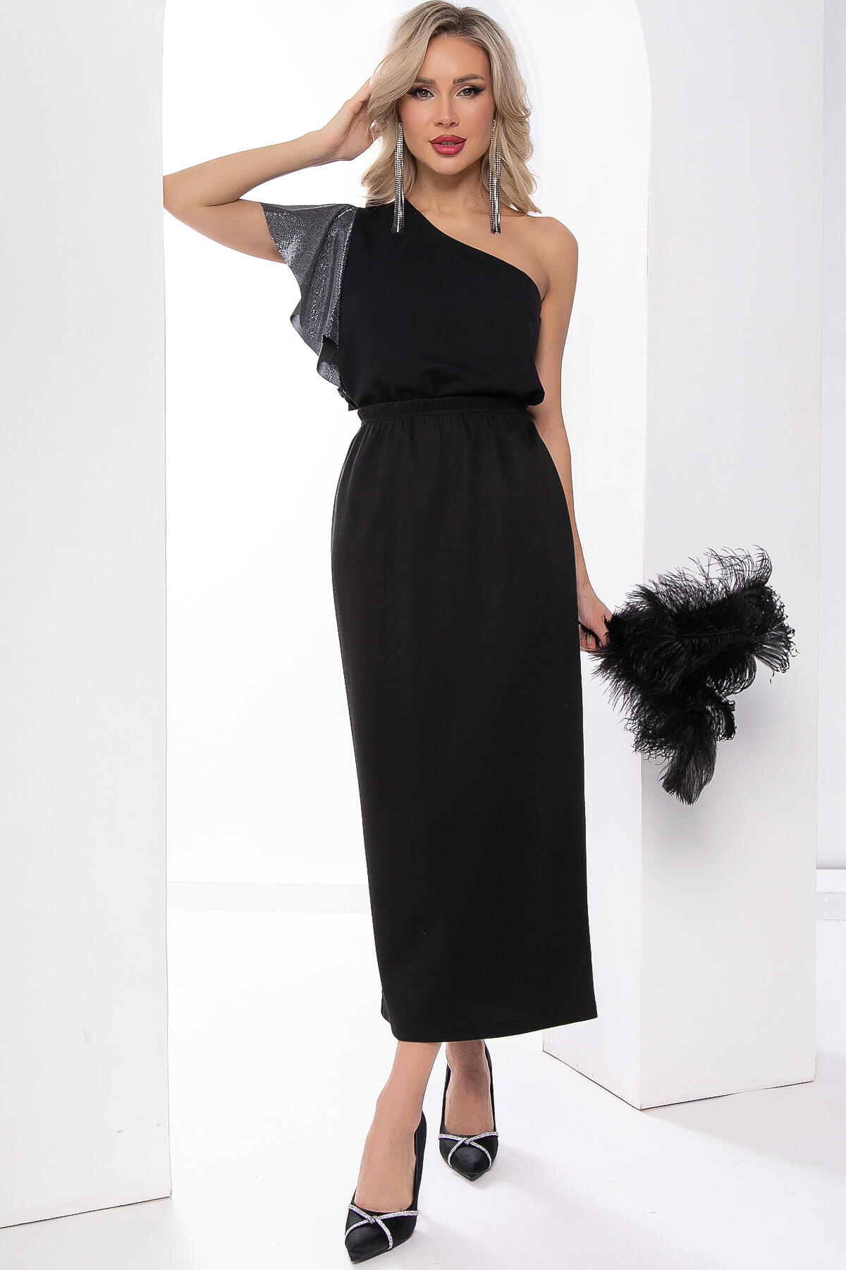 Прекрасный выбор! Черный топ на одно плечо с рукавом-воланом - стильный и элегантный элемент гардероба. Создайте невероятные образы, сочетая его с разнообразными брюками, юбками или джинсами.