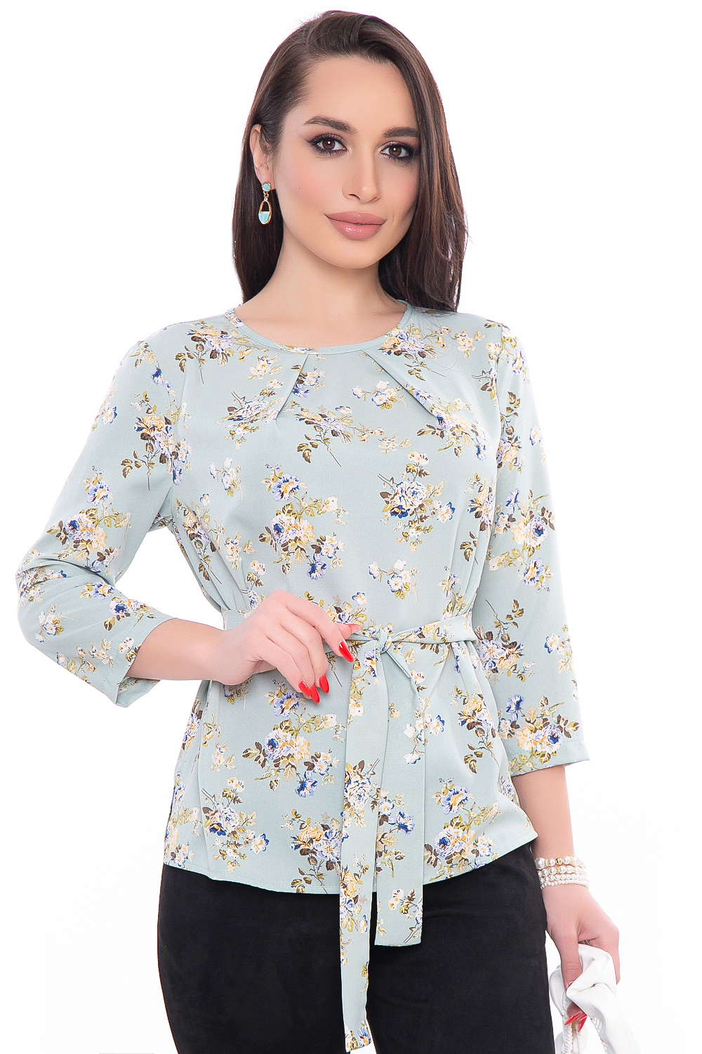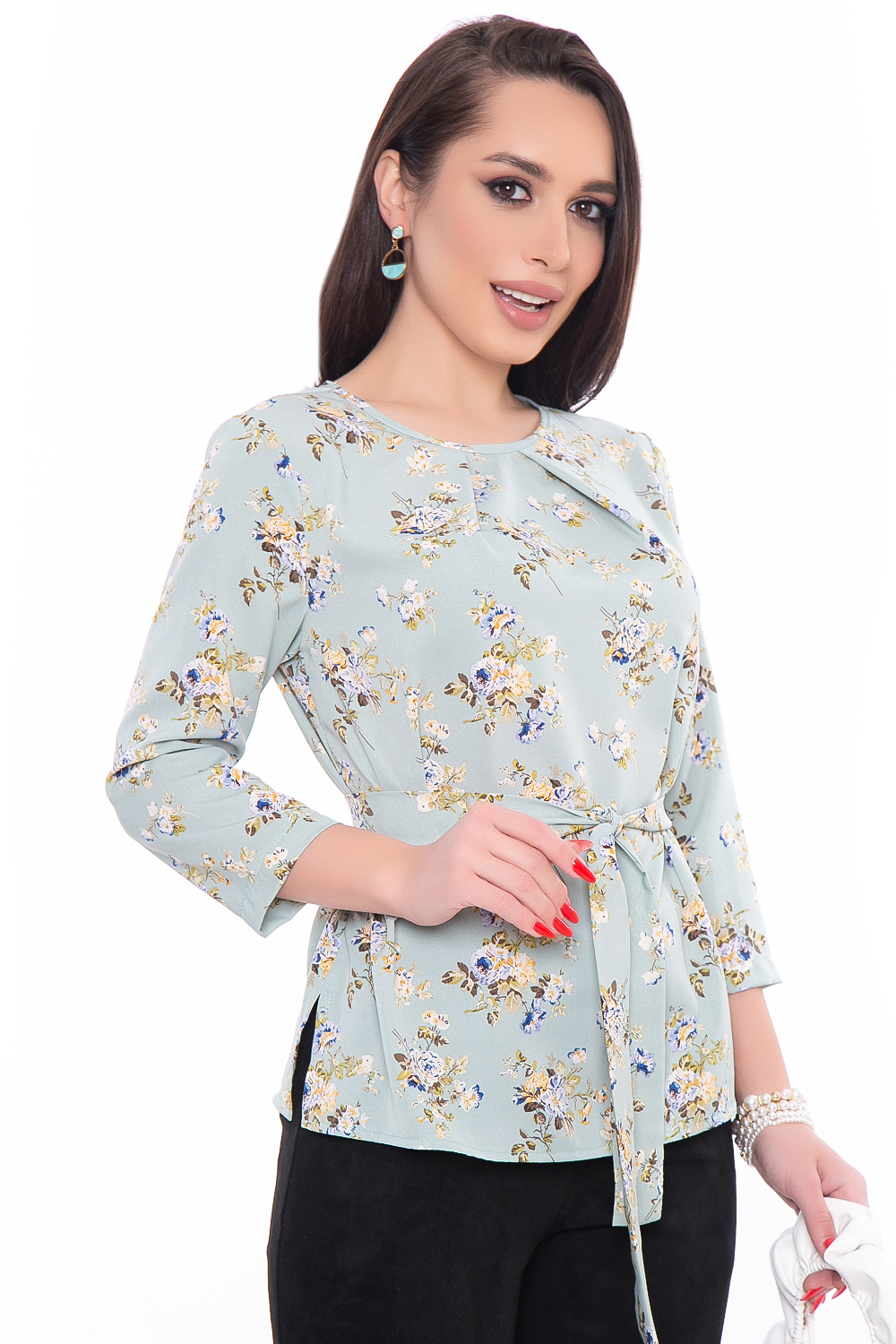 Классическая блуза в нежном оттенке с цветочным принтом. Свободного кроя с защипами по переду, классический округлый вырез горловины, рукав втачной, три четвертых. В комплекте тканевый поясок, по бокам разрезы.