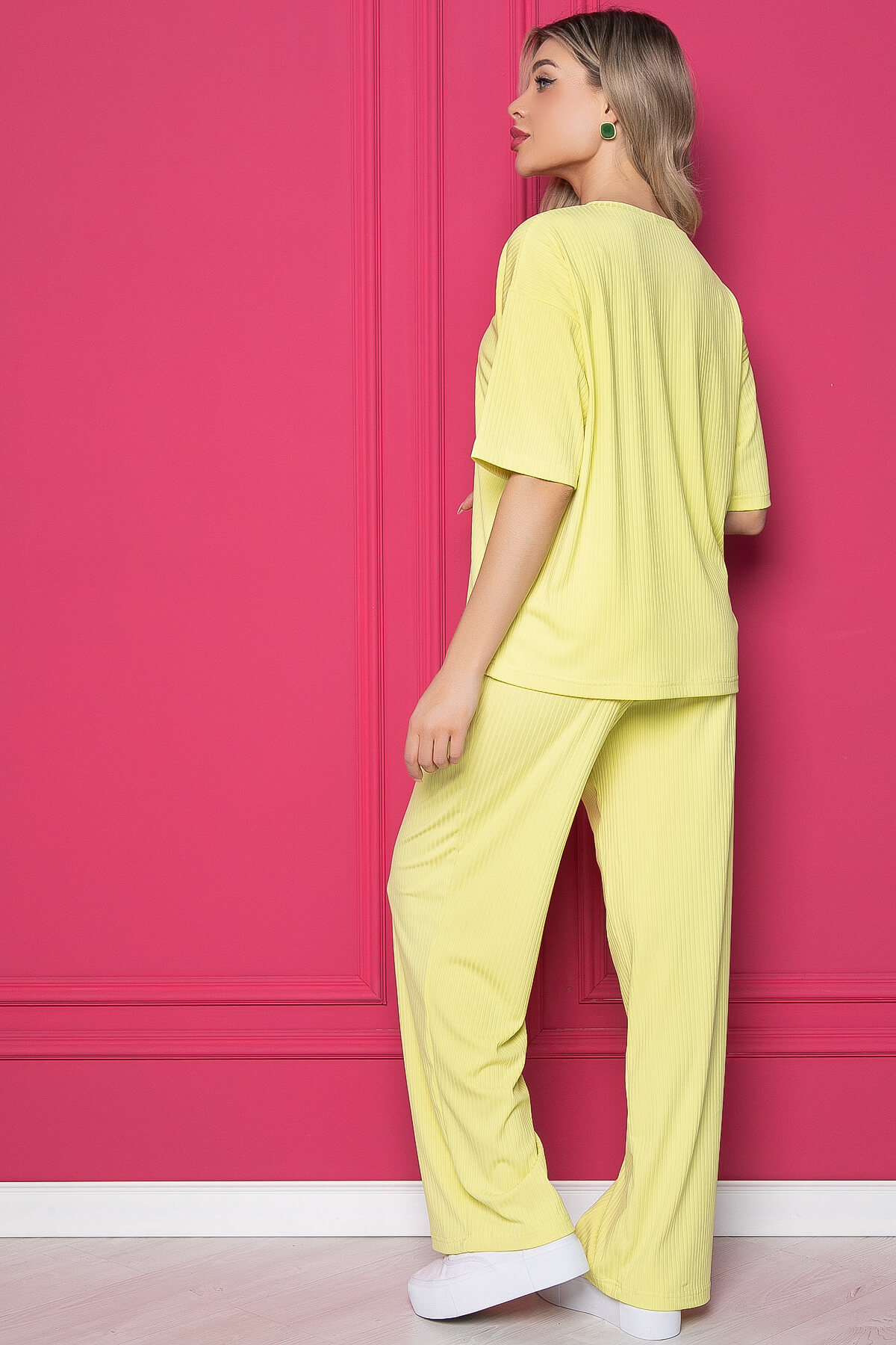 Легкий костюм, состоящий из брюк с высокой посадкой на резинке и футболки свободного кроя. Костюм подходит для повседневного использования, прогулок в летнюю погоду. Свободный крой позволяет чувствовать себя комфортно, прекрасно сочетается с обувью на плоской подошве и каблучке. В прохладные дни костюм можно дополнить джинсовой курткой.