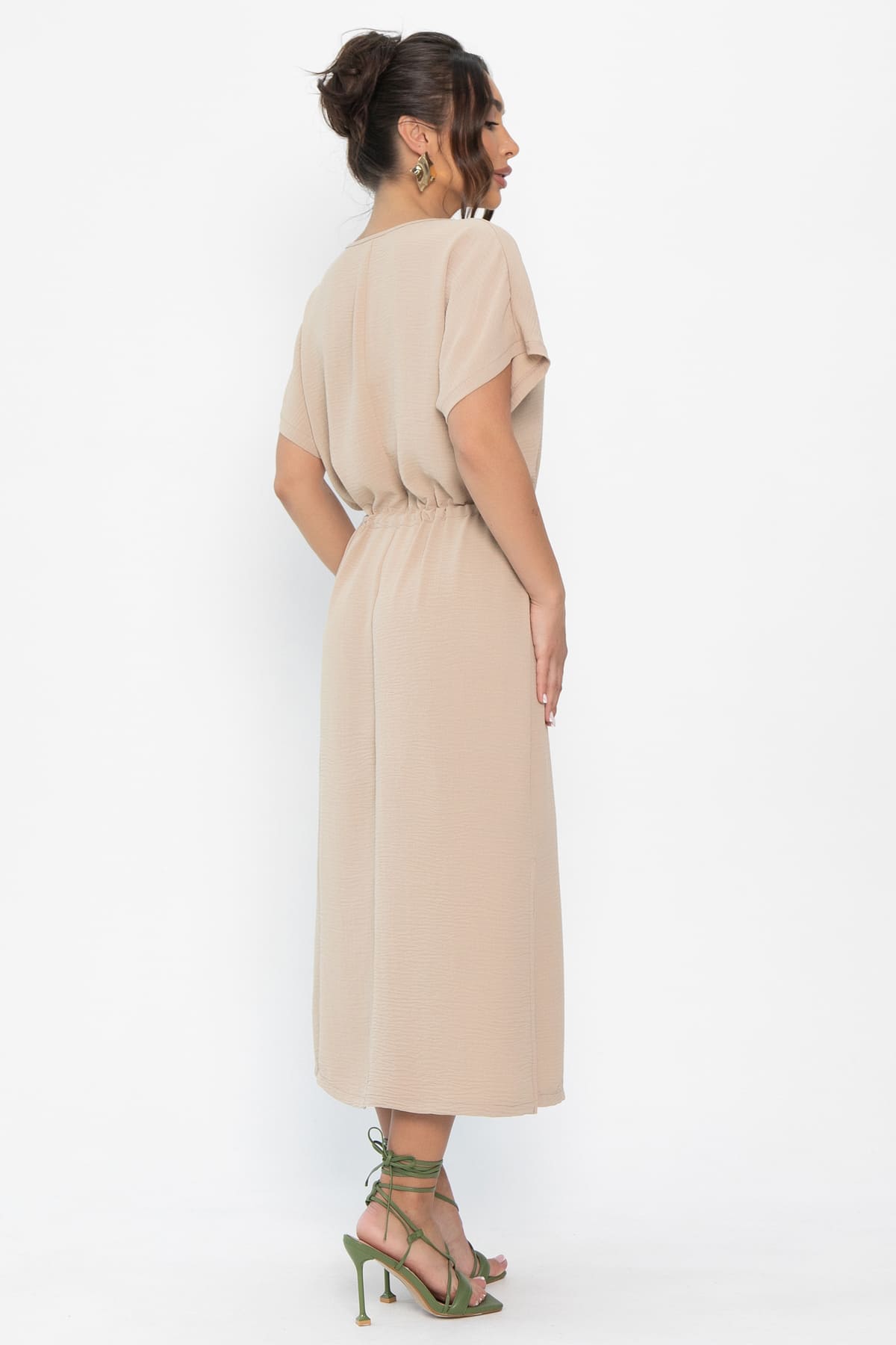 Платье в бежевом цвете — это ваш универсальный спутник на все случаи жизни. Оно комфортное и подходит для любых ситуаций — будь то прогулка по городу или романтический ужин. Благодаря небольшим разрезам по бокам, платье выглядит игриво и легко. Однотонная палитра платья позволяет экспериментировать с аксессуарами. А кулиска на талии подчёркивает фигуру и создаёт идеальный силуэт.