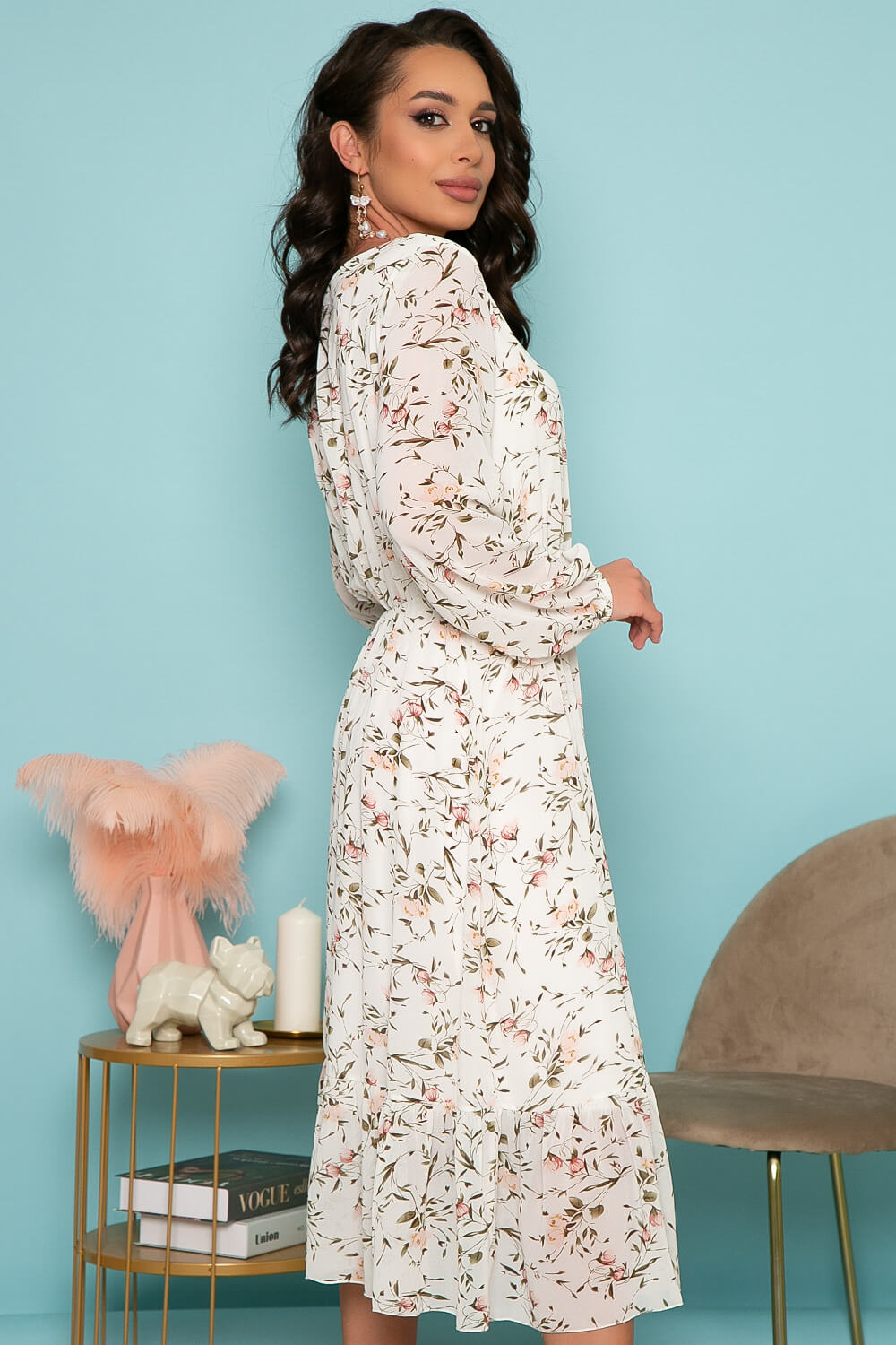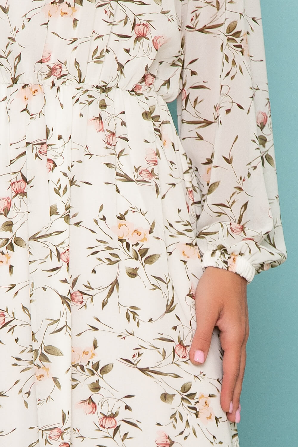 Шифоновое платье летящего кроя с нежным цветочным принтом прекрасно подойдет для создания романтичных повседневных образов в лений период. В прохладную погоду можно надеть с жакетом или даже с пальто или тренчем. Платье на подкладке, рукав втачной, длинный, на резинке. Мягкий округлый вырез горловины, талия на резинке, спинка разрезная. По низу платья широкий волан. В комплекте пояс из основной ткани.