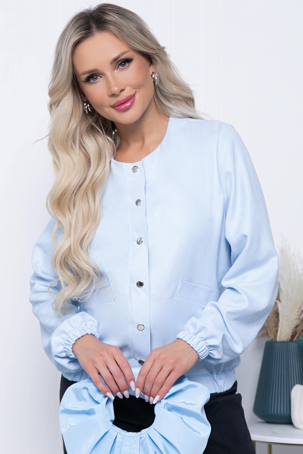 Куртка-бомбер в благородном голубом оттенке - идеальный вариант для летнего гардероба! Когда на улице ветрено, надевайте под него лонгслив, а если тепло, то майку или футболку. Рукав втачной, длинный, по переду застегивается на кнопки, есть карманы.
