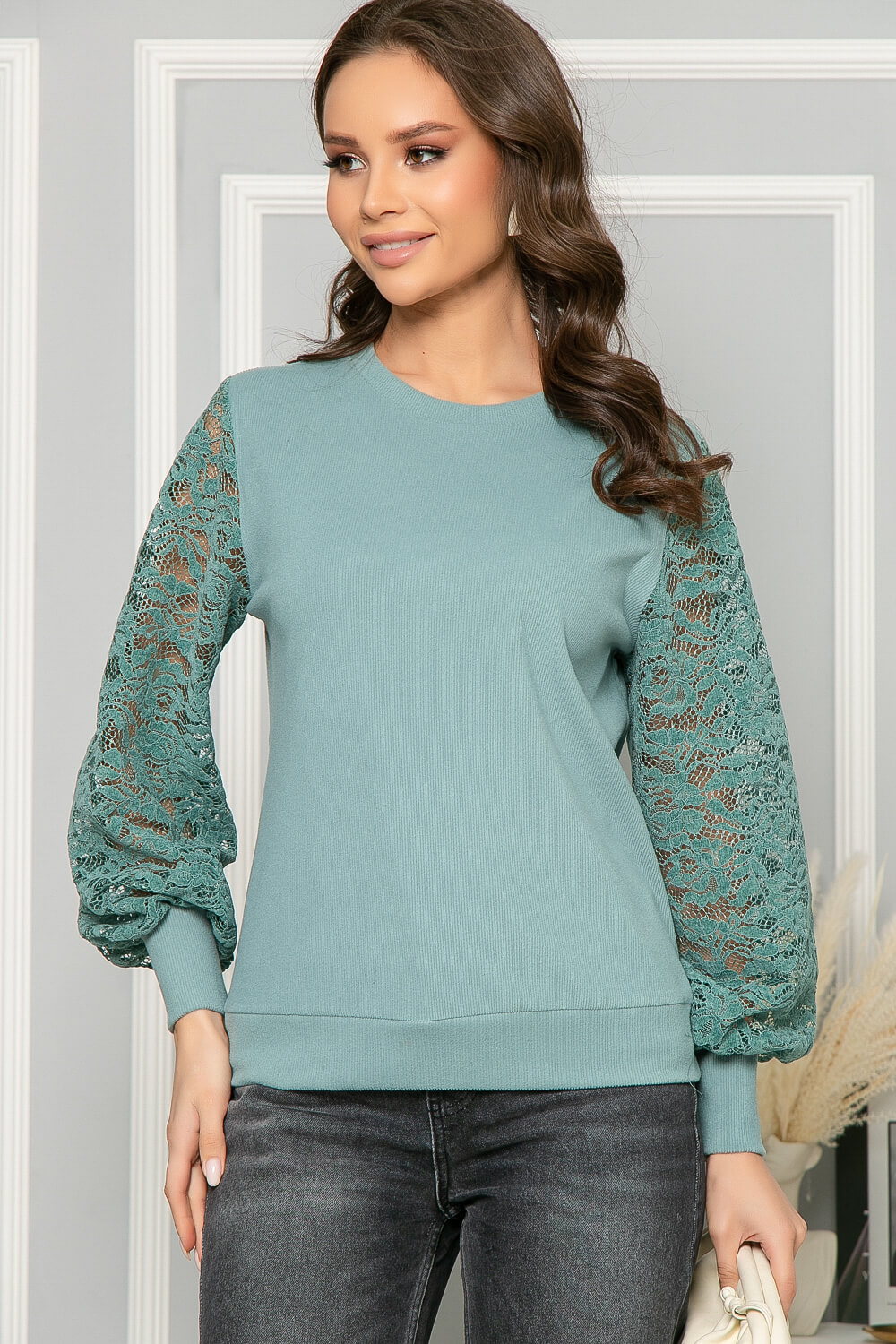 Мягкий джемпер с пышным ажурным рукавом станет фаворитом весеннего гардероба. Такая модель способна гармонично украсить любой образ. Для соблюдения баланса в силуэте к объёмному верху подбирайте ровный или зауженный низ.