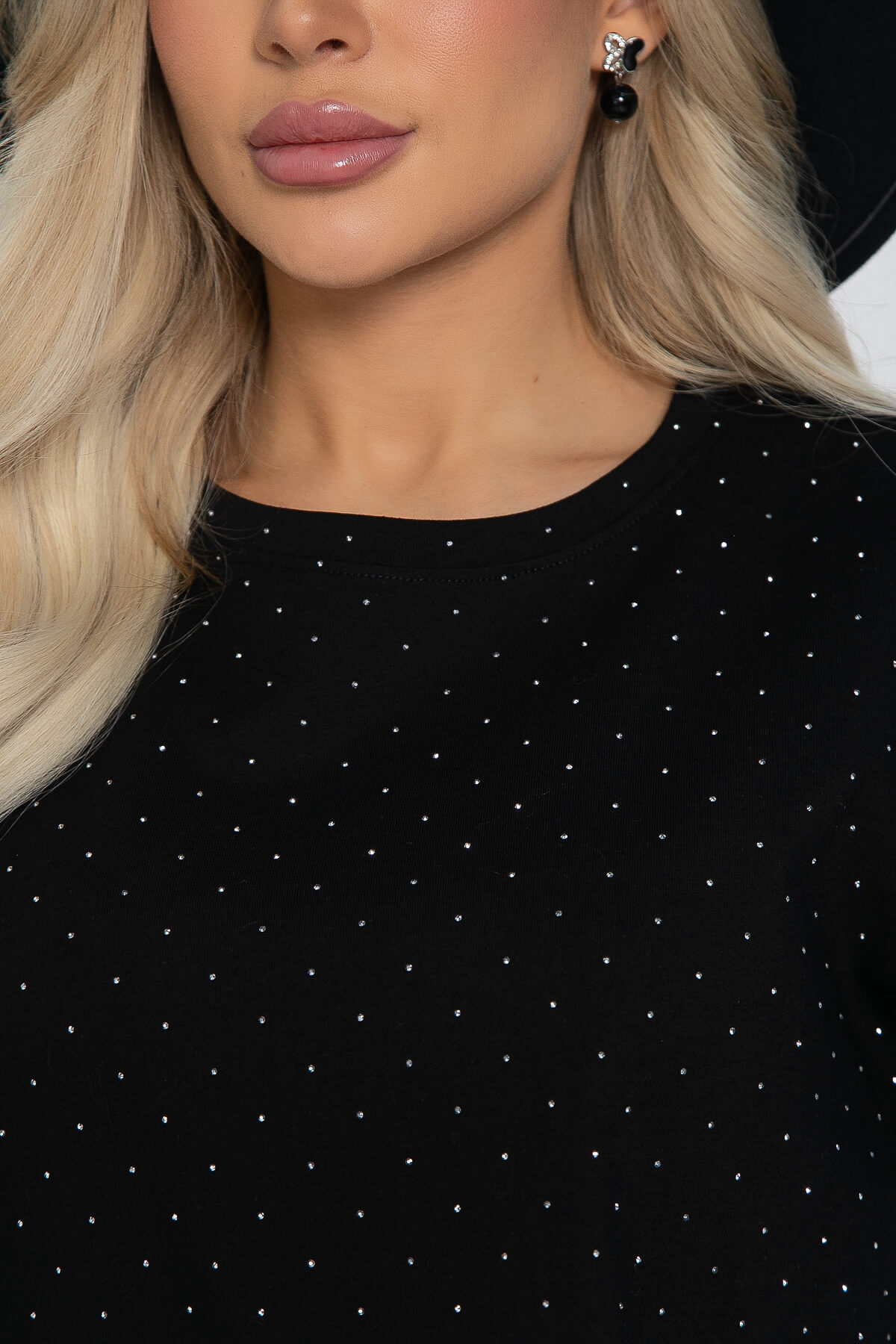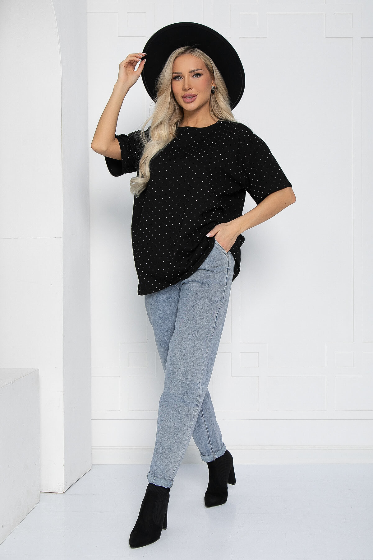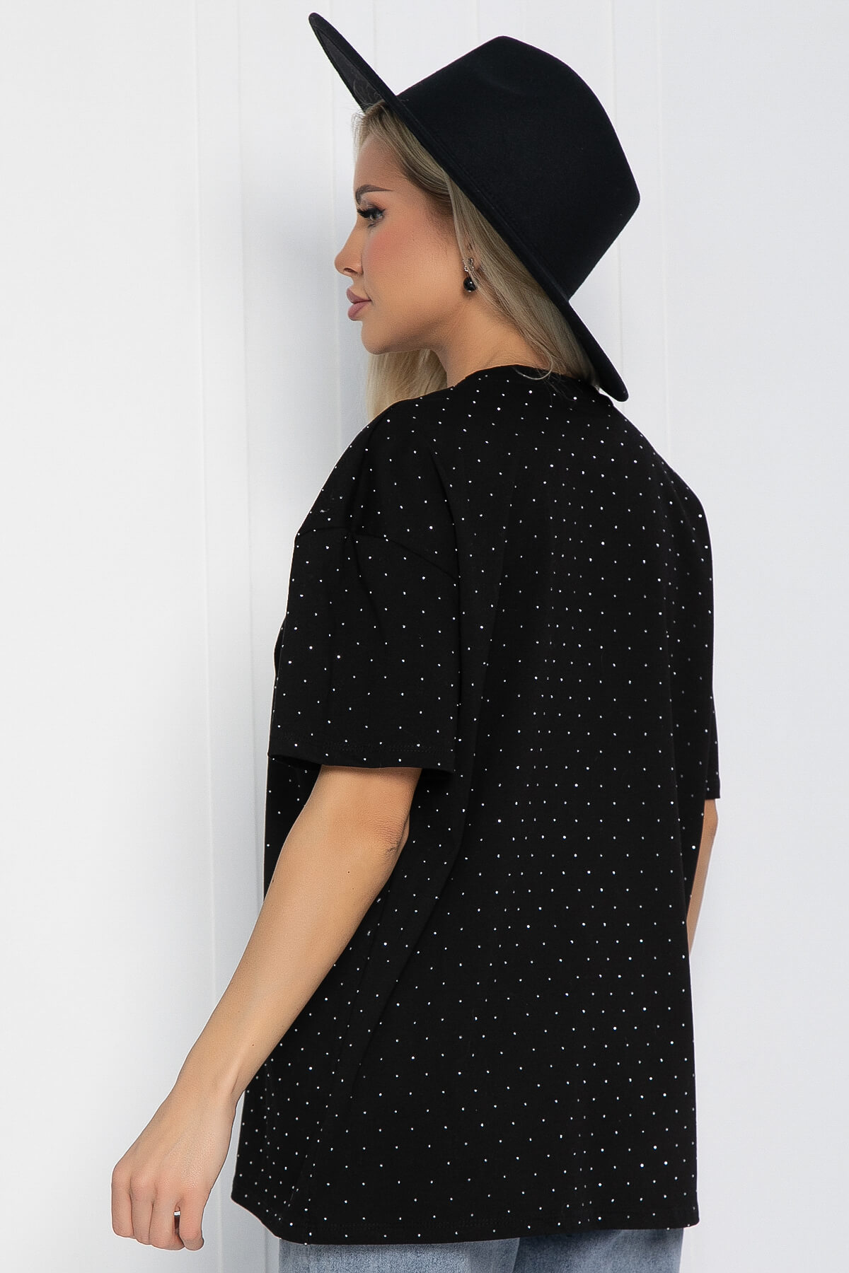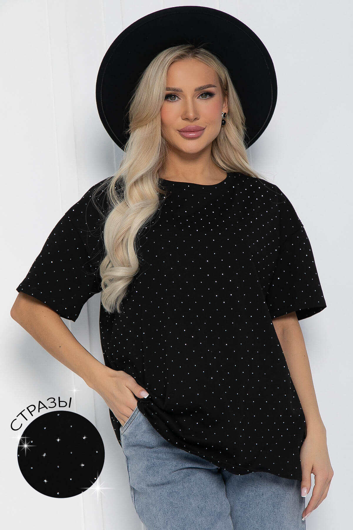 Футболка со стразами в классическом чёрном цвете — это идеальный выбор для тех, кто хочет разнообразить свои повседневные образы. Она гармонично сочетается с любой одеждой, что делает её универсальной и незаменимой в вашем гардеробе. Эта футболка выполнена из мягкой и приятной на ощупь ткани с хлопком в составе. Она имеет свободный прямой крой, округлый вырез горловины и короткие рукава, что обеспечивает комфорт и стиль в любой ситуации.