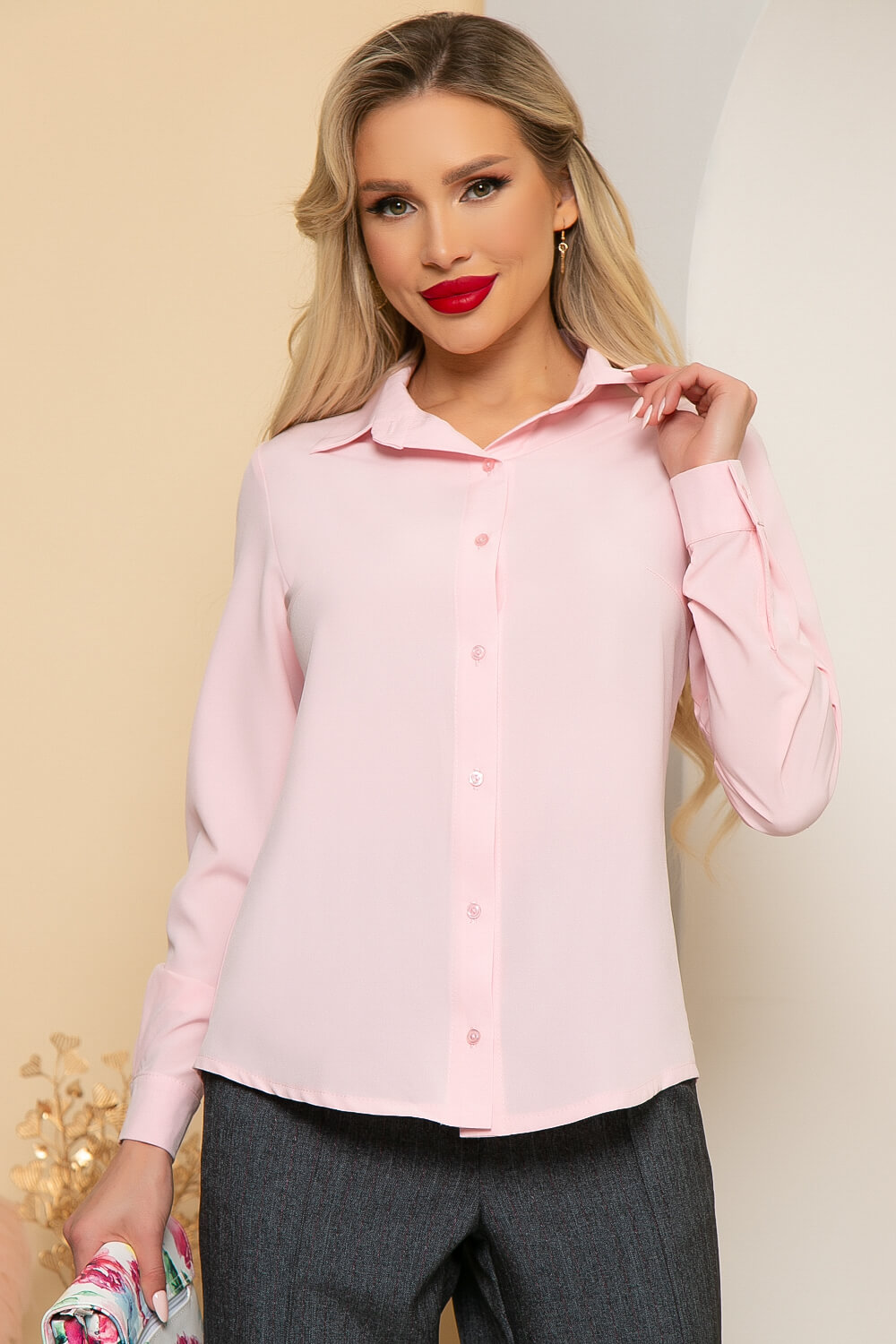 Блуза полуприлегающего силуэта, выполненная из приятной к телу ткани, в красивом розовом оттенке, который хорошо будет сочетаться с Вашим деловым гардеробом. Рукав втачной, длинный, низ рукава на манжете. Спинка скруглена.