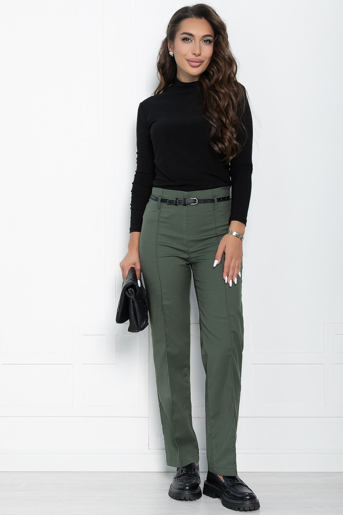 Классические брюки в оттенке хаки, по переду изделия имеются стрелки, что визуально правильно вытянет силуэт и сделает фигуру стройнее. Сбоку потайная молния. Вариант для офисных будней в классических образах. Так же актуально будет смотреться с водолазкой или свитеров в повседневных вариантах. Ремень чёрный из экокожи в комплекте.