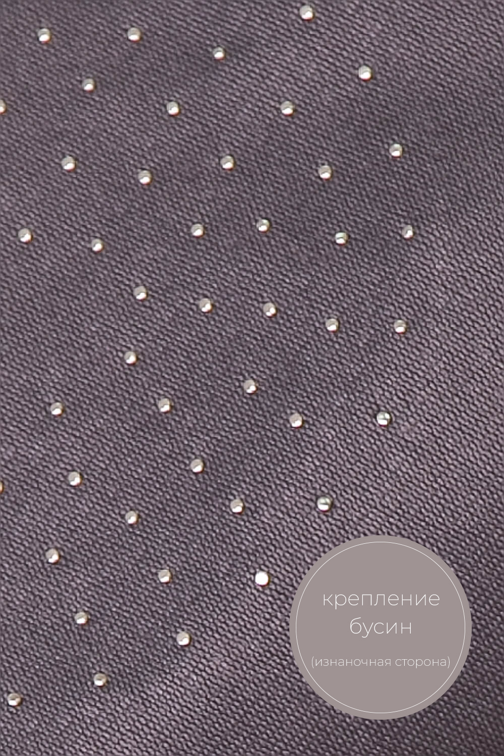 Костюм-двойка, состоящий из брюк и жакета. Брюки по талии на резинке, слегка заужены книзу. Жакет по переду застёгивается на пуговицы, рукава украшены серебристыми бусинами с надёжными креплениями. Такой костюм может быть быть использован для создания повседневного или делового образа.