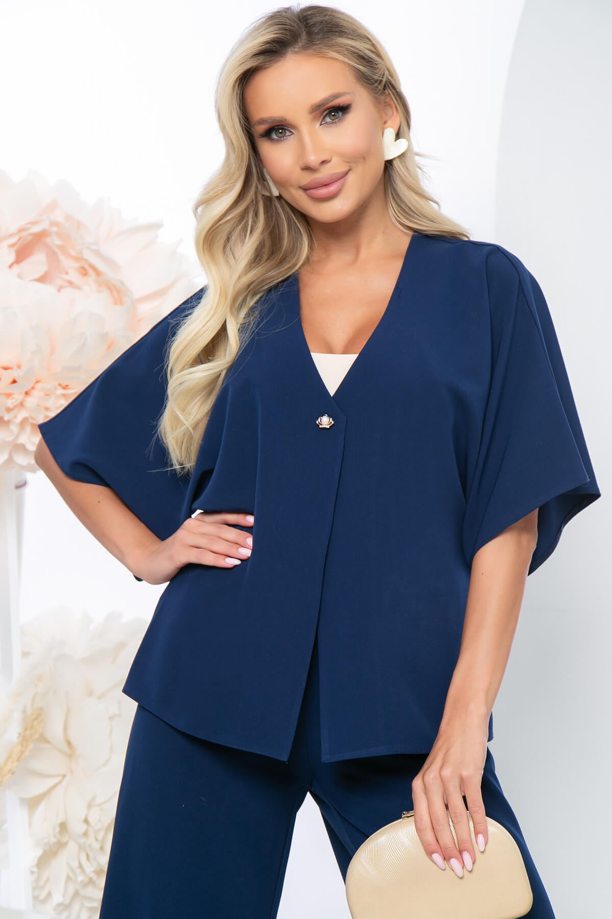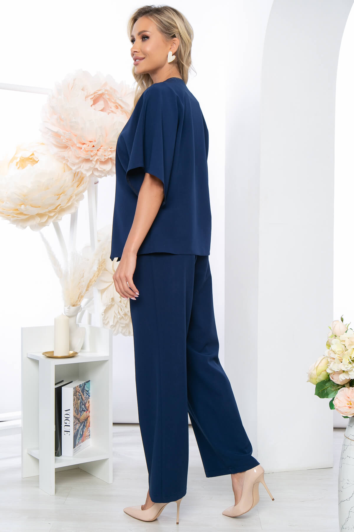 Костюм-двойка, состоящий из классических брюк прямого кроя и жакета свободного кроя. Данный комплект можно носить, подчеркнув талию поясом из основной ткани. Жакет скроен по типу "Летучая мышь", застёгивается на пуговицу. Брюки по талии на резинке. Пояс из основной ткани входит в комплект.