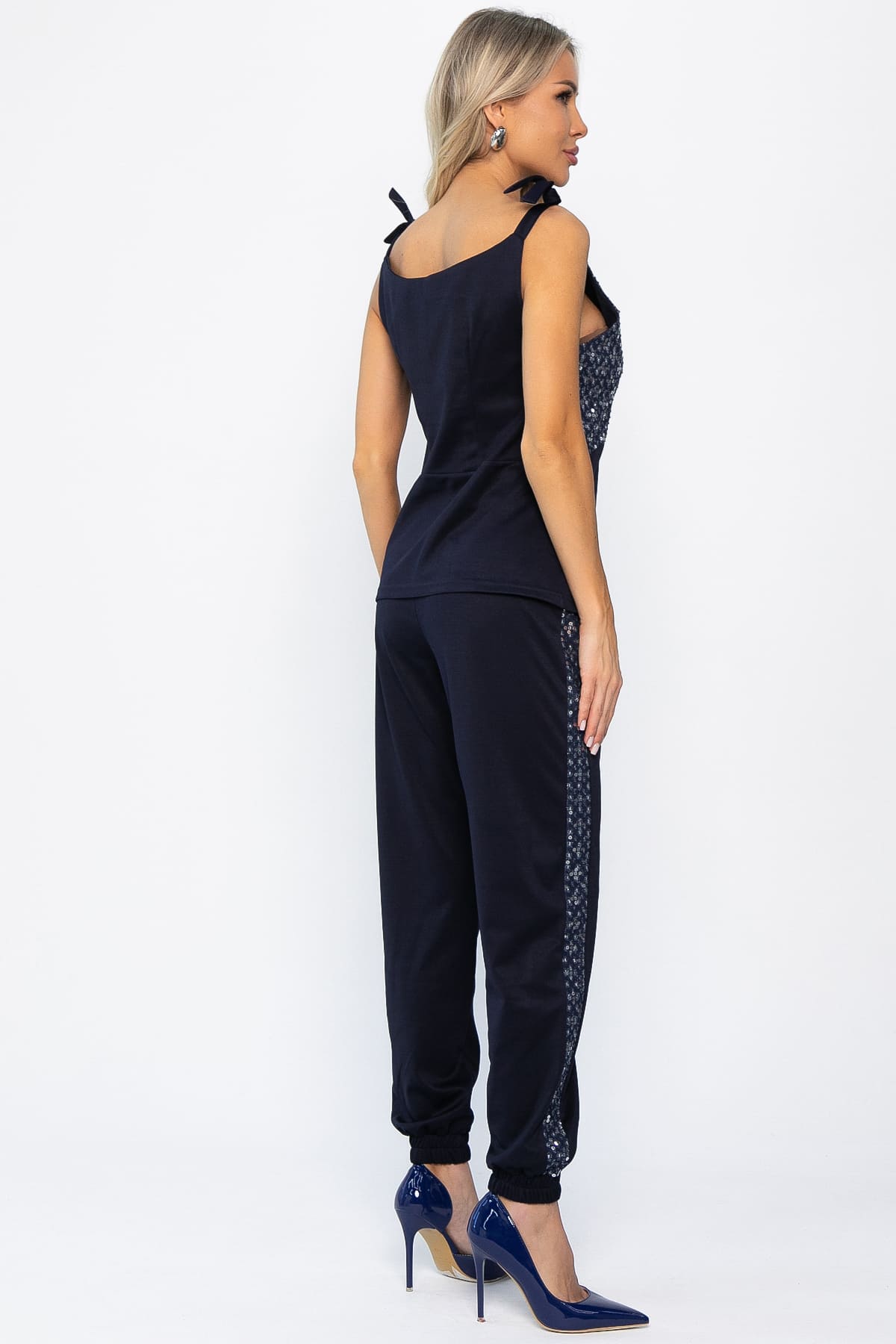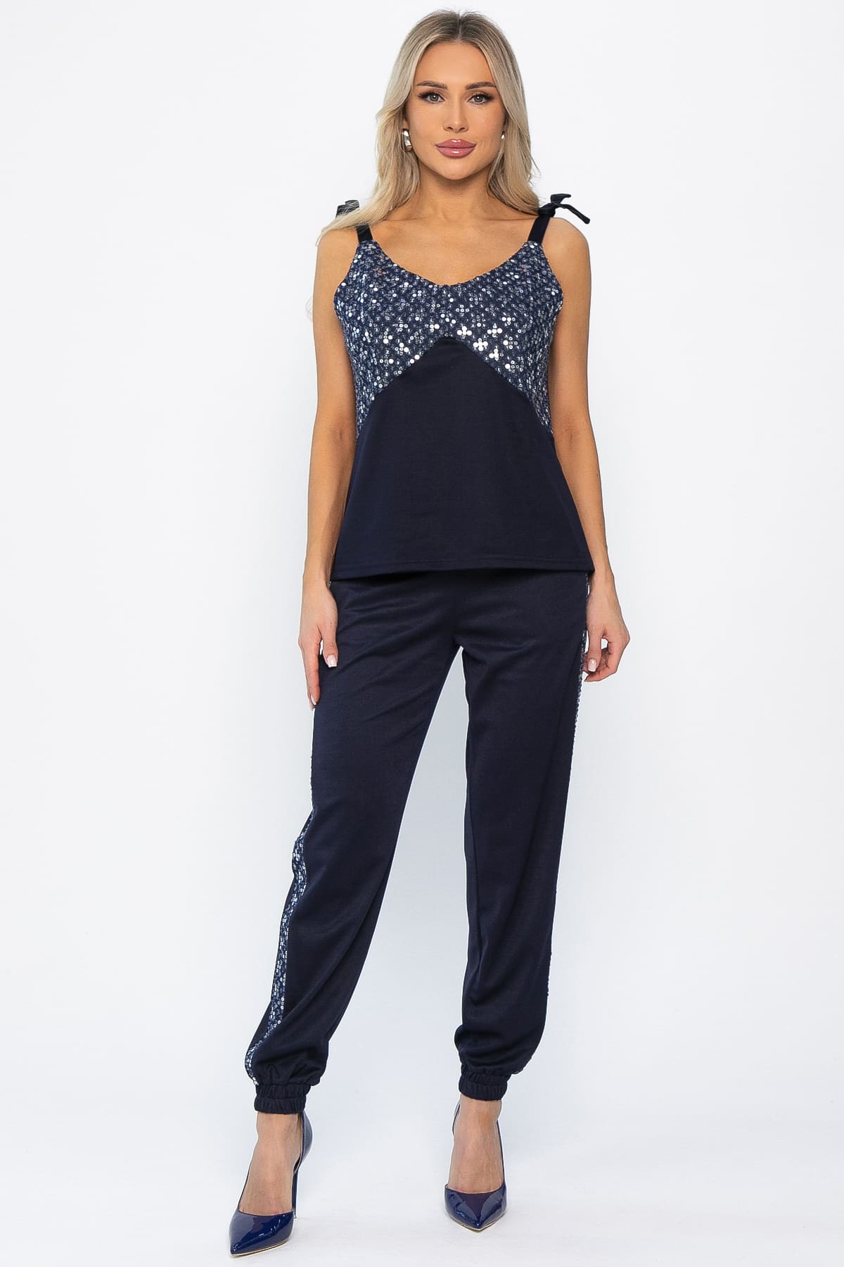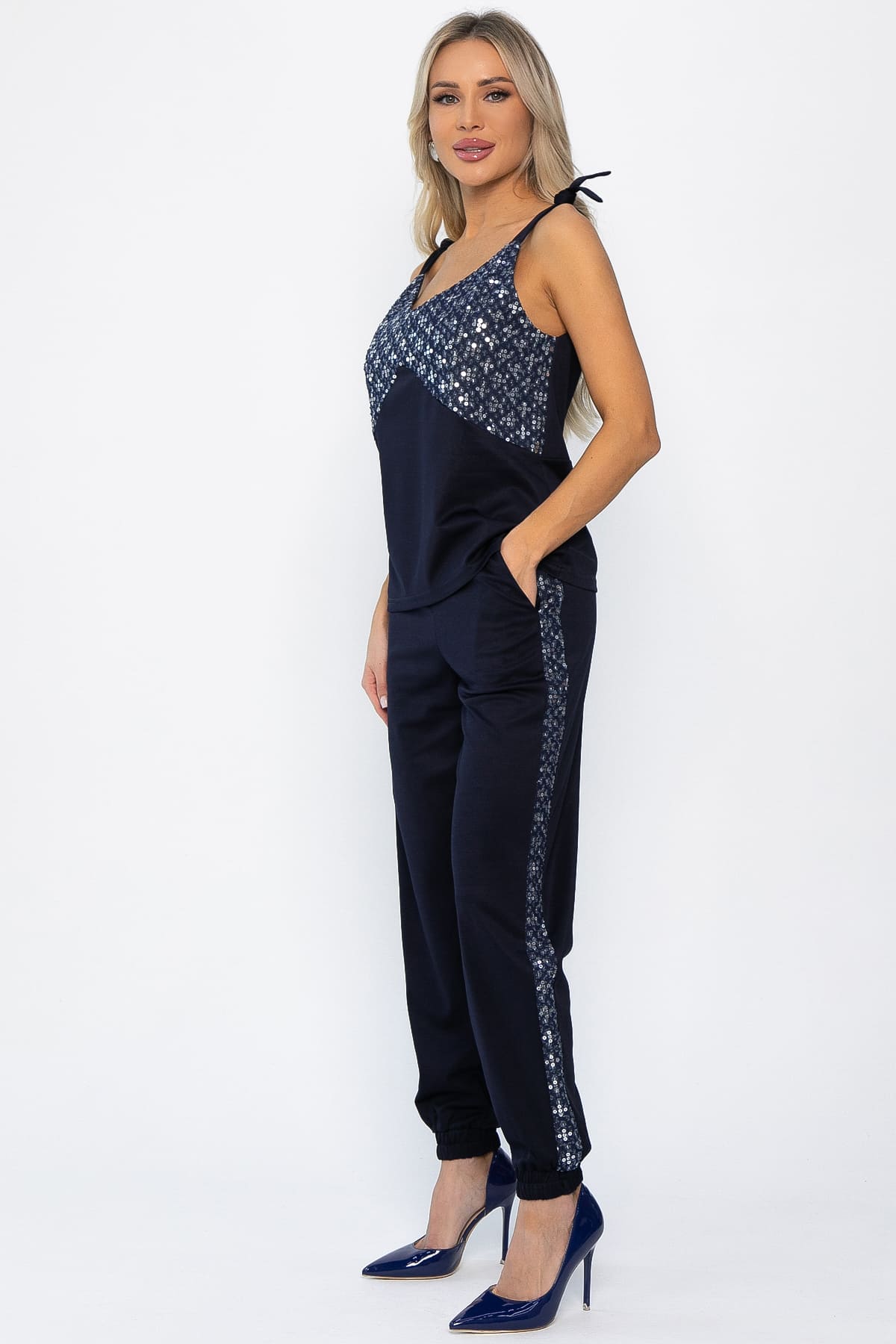Этот праздничный костюм для женщин — истинный символ стиля и элегантности. Он представляет собой двойку, состоящую из брюк и топа, изготовленного из трикотажного полотна. Весь образ превращается в настоящее произведение искусства благодаря блестящим элементам в топе и брюках, которые плавно переливаются на свету. Весьма женственный крой делает этот коктейльный костюм настоящей находкой для торжественных мероприятий, таких как выпускной, свадьба или корпоратив. Темно-синий глубокий цвет придает образу загадочности и элегантности.